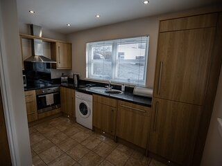 The kitchen is fully fitted with electric oven and hob, microwave, fridge and separate freezer, washing machine/dryer, dishwasher, toaster and kettle.